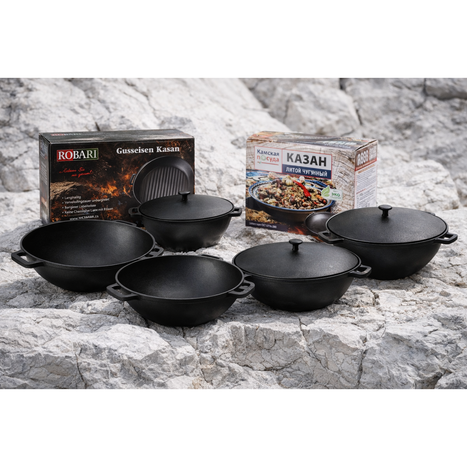 Große Auswahl an hochwertigen gusseisernen Kesseln für die Zubereitung saftiger und aromatischer Gerichte. Ideal für Plov, Fleisch, Suppen und Gerichte über offenem Feuer. Sie zeichnen sich durch hohe Robustheit, gleichmäßige Wärmeverteilung und Langlebigkeit aus. Geeignet für alle Herdarten sowie für die Nutzung über offenem Feuer.