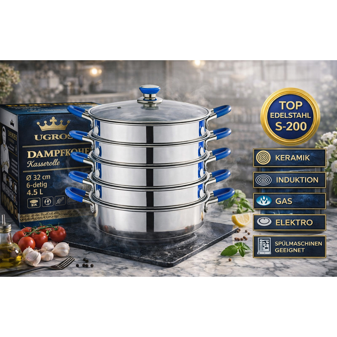 Praktische, mehrstufige Dampfgarer für die Zubereitung von saftigen und geschmackvollen Speisen. Ideal für Manti, Pelmeni und andere Gerichte. Robuste Konstruktion, gleichmäßige Dampfverteilung und geeignet für alle Herdarten, einschließlich Induktion.