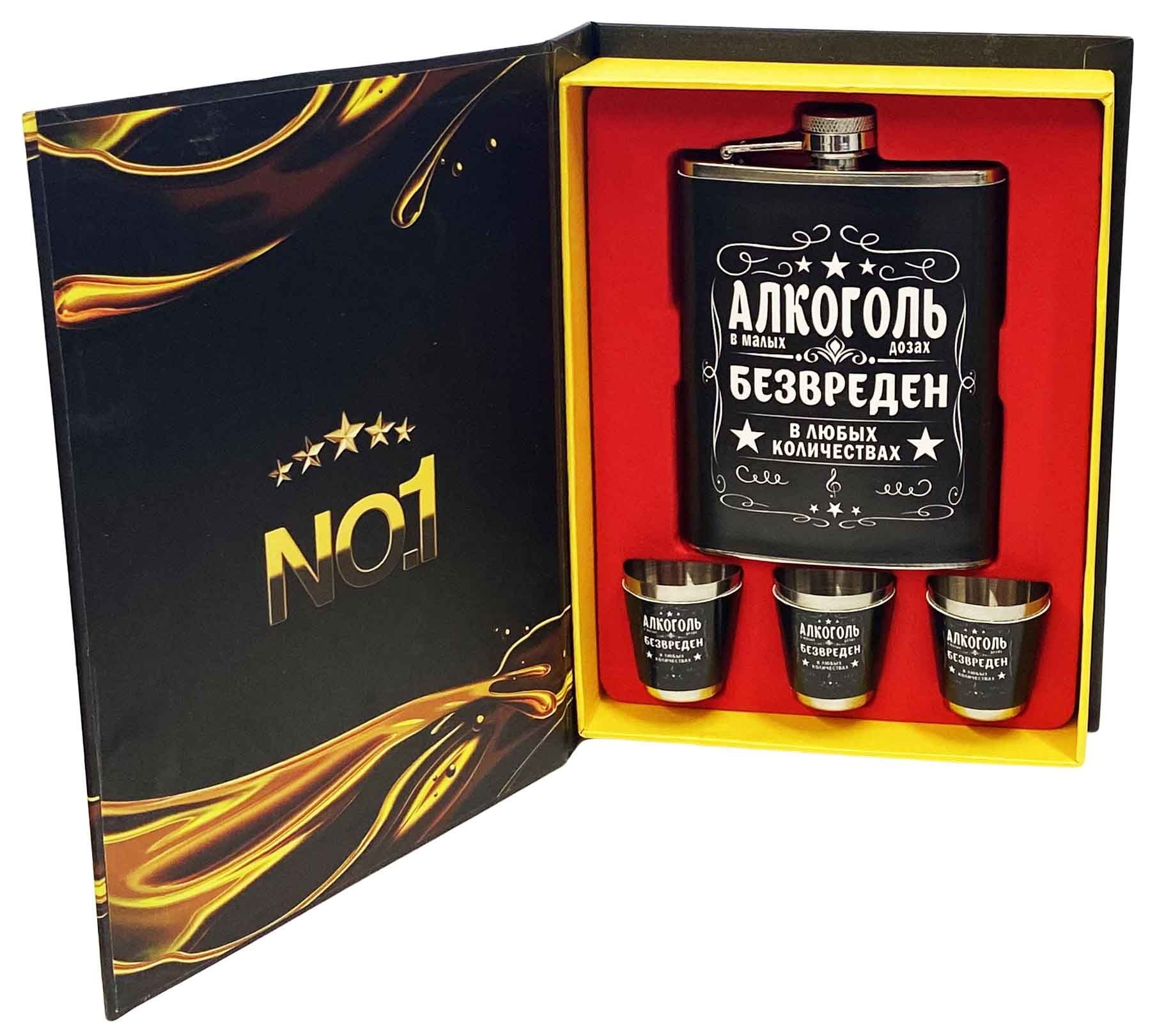 Produktinformationen: Flachmann-Set in einem Buch mit drei Schnapsgläsern "Алкоголь в малых дозах", 240 ml