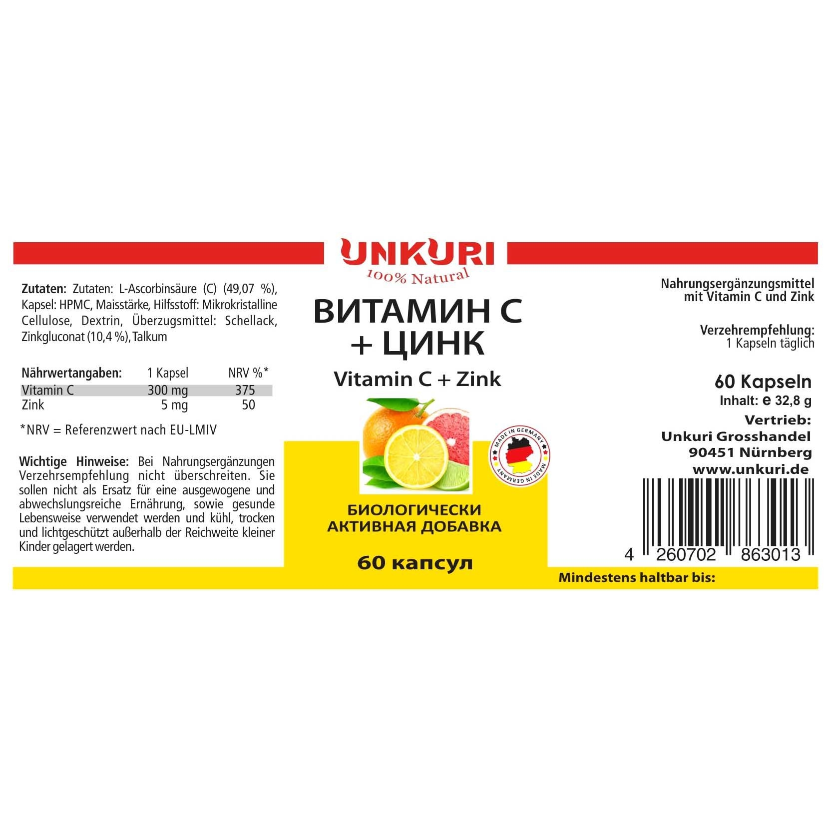 Zusammensetzung: L-Ascorbinsäure (C) (49,07 %), Kapsel: HPMC, Maisstärke, Hilfsstoff: Mikrokristalline Cellulose, Dextrin, Überzugsmittel: Schellack, Zinkgluconat.